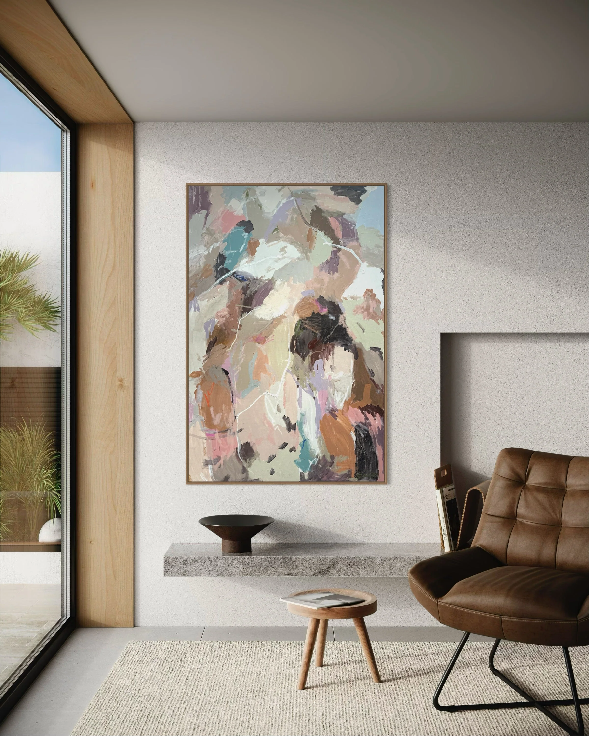 “Beneath the Quiet” is a layered exploration of earth and memory—where warm ochres, muted pinks, and deep charcoal tones converge in a quiet, emotive rhythm. This abstract composition draws from the grounded textures of nature and the ephemeral quality of human experience. Each gesture holds both weight and transparency, suggesting moments of clarity within the blur of reflection. It invites stillness, yet pulses with the unseen movements beneath the surface—like soil stirred by roots or thoughts shifting in silence.