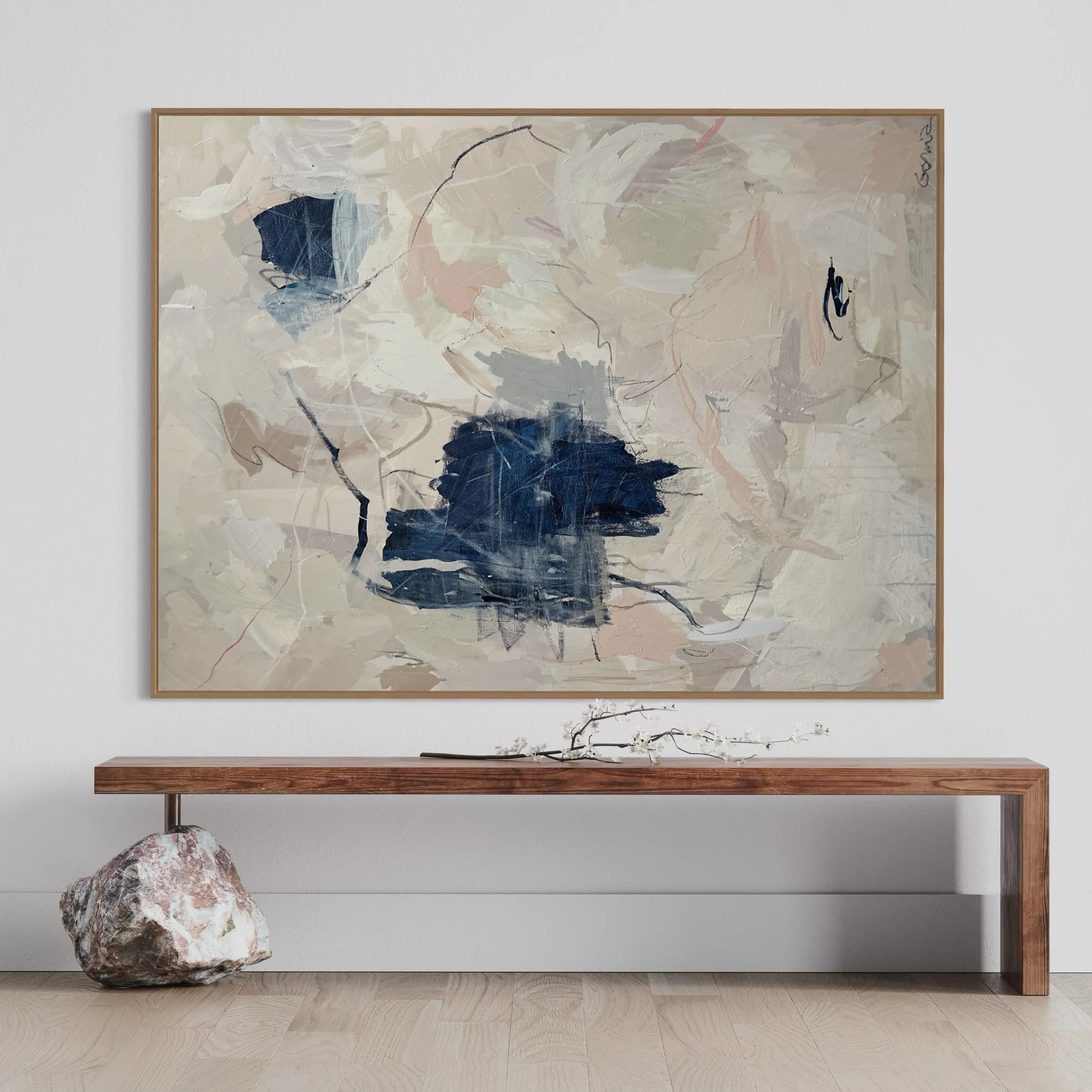 In "Lumen", gestural marks float within a textured surface, suggesting light breaking through shadow. The palette of muted tones and deep indigos creates depth and dimension, while the layered application invites closer contemplation. The work captures the quiet resonance of illumination in abstraction.